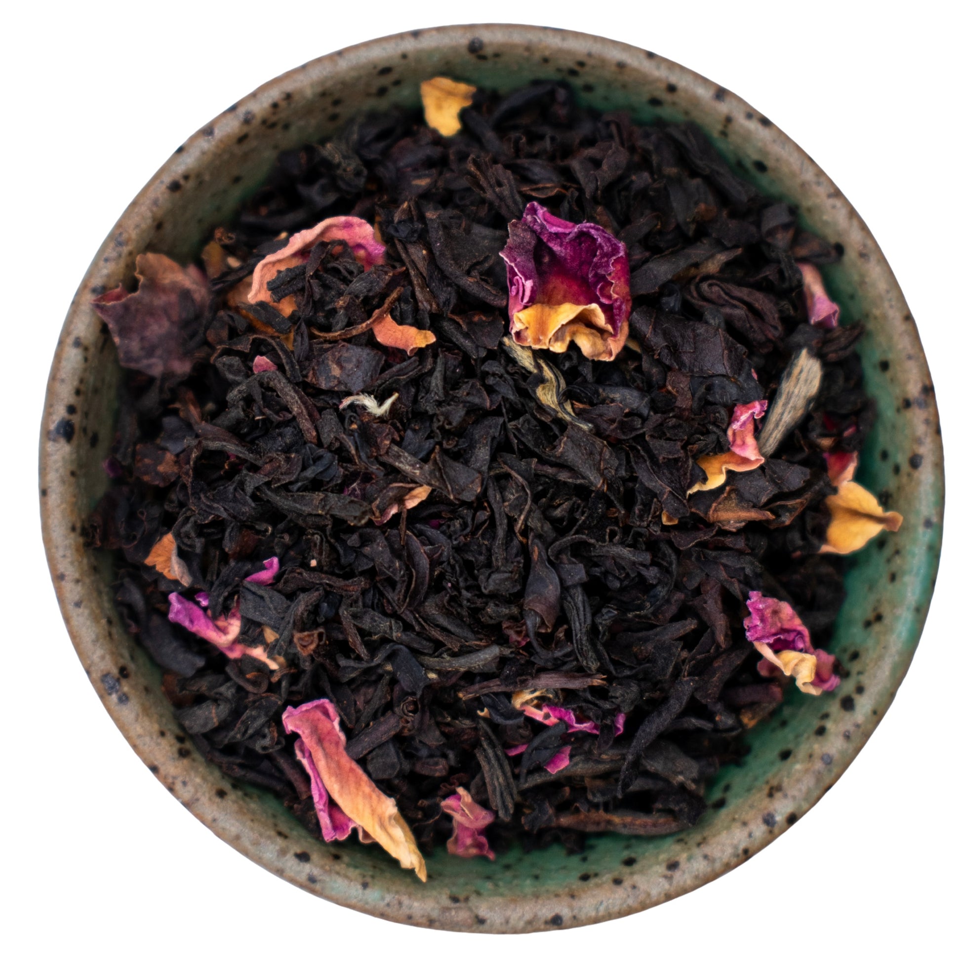 Bold rose notes bloom over the dark tea, offering a graceful, aromatic experience.