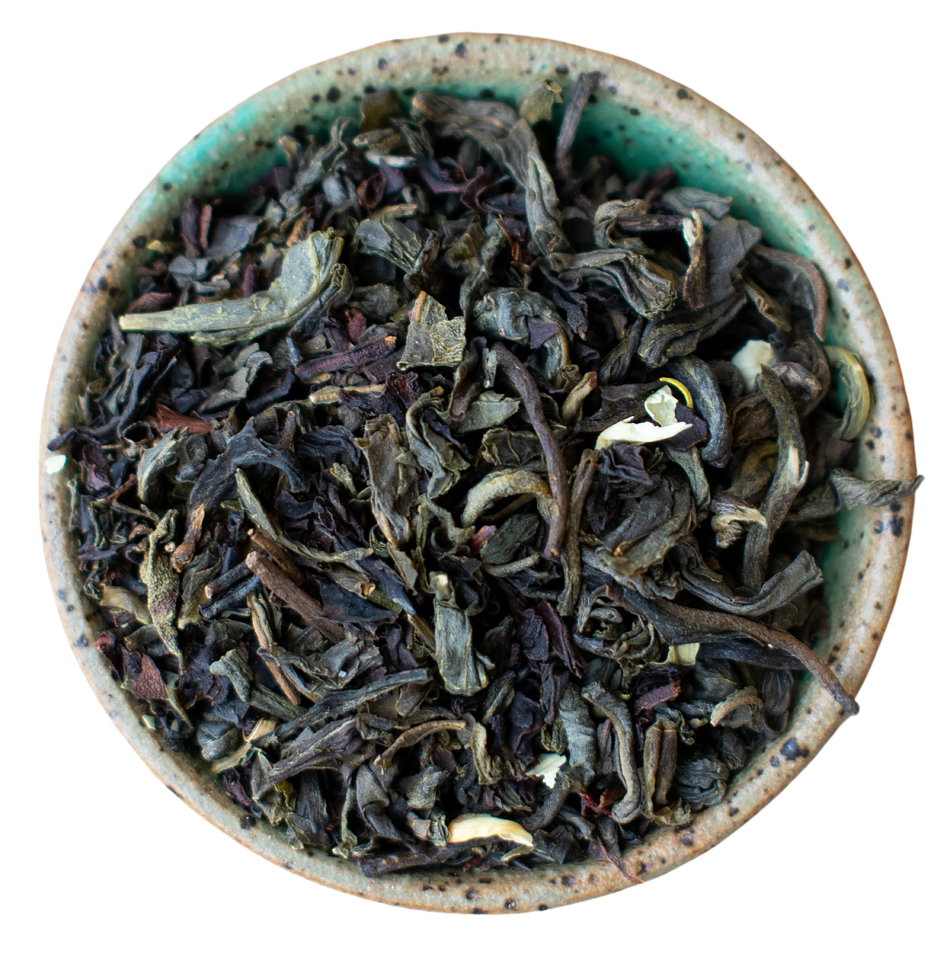 Jasmine Blueberry (formerly known as “Kiss of Blueberry”) is a delightful, soothing blend that marries the vibrant brightness of organic green tea and black tea with the sweet, tangy undertones of berries, floral jasmine, and a touch of exotic hibiscus. This tea is a refreshing, yet subtly complex brew that evokes the playful, sweet sensation of a kiss with the natural flavors of blueberries and a symphony of complementary ingredients. Whether enjoyed hot or iced, it offers an invigorating experience that feels both comforting and uplifting.