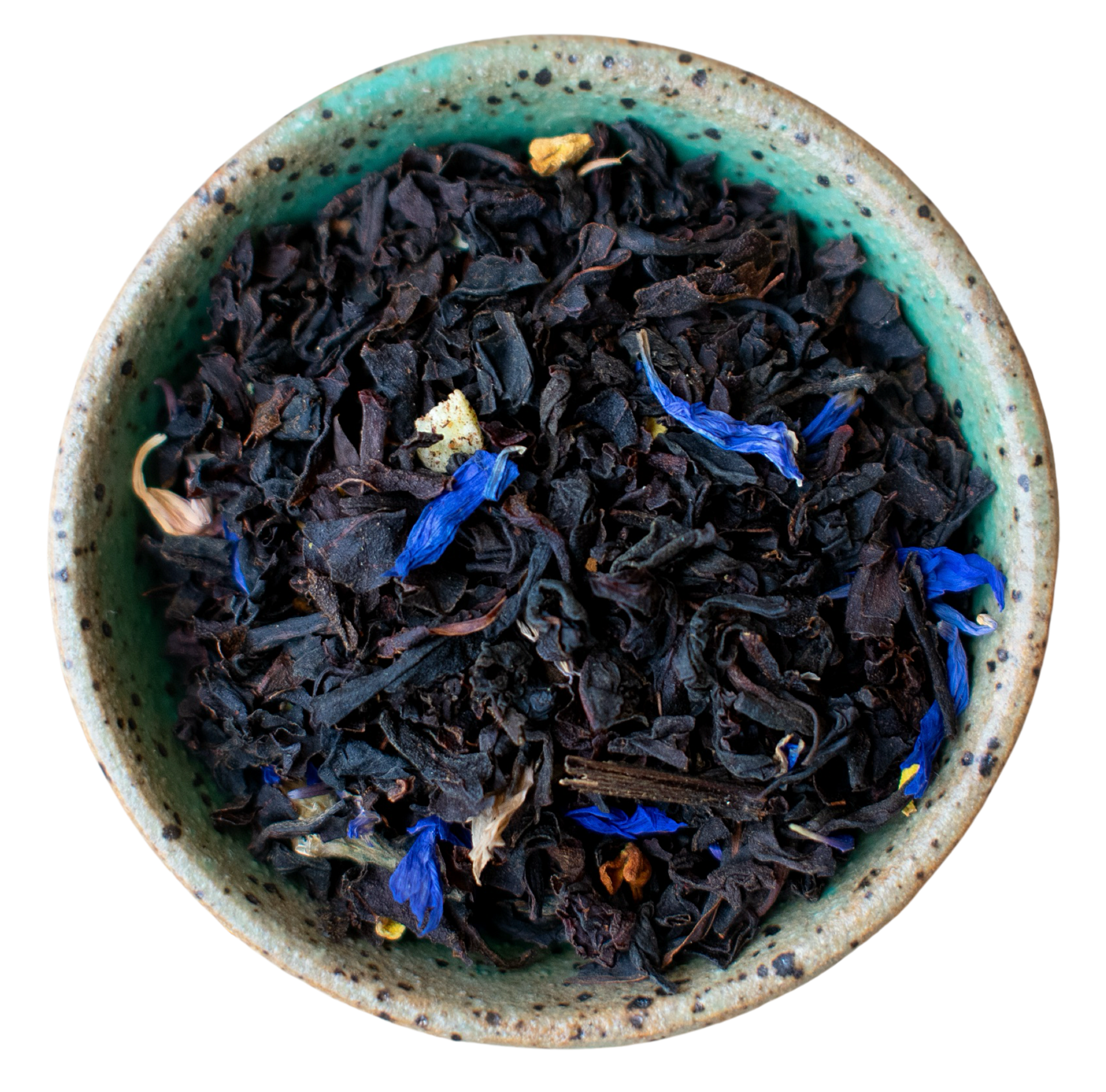 Ingredients: Organic black tea, osmanthus petals, blue cornflowers, coconut pieces, bergamot oil, and natural flavors.