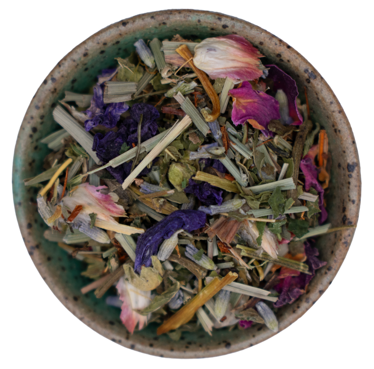 Ingredients: Rooibos, spearmint, lemongrass, nettle lavender, passion flower, lemon verbena, rose petals, willow bark, plum and mallow petals.