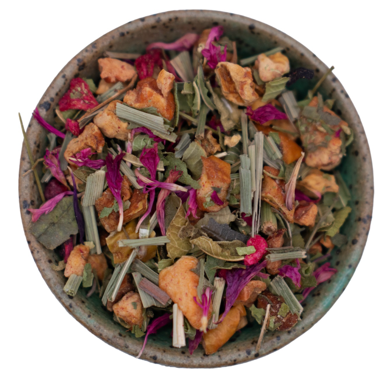 Ingredients: Apple pieces, lemon verbena, lemongrass, hibiscus, lemon pieces, raspberry pieces, cornflower petals, natural flavors (organic compliant)