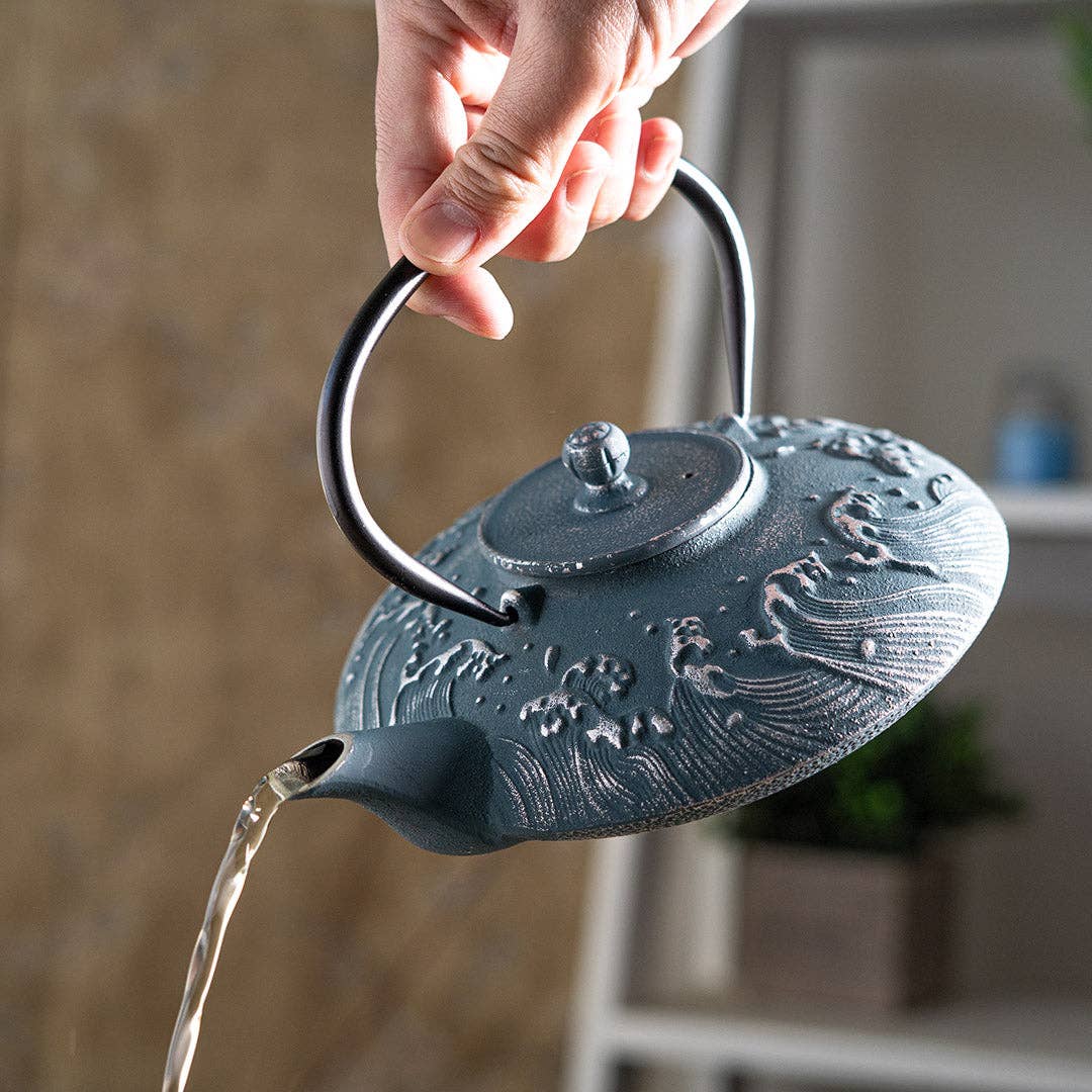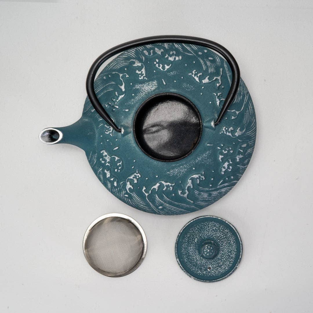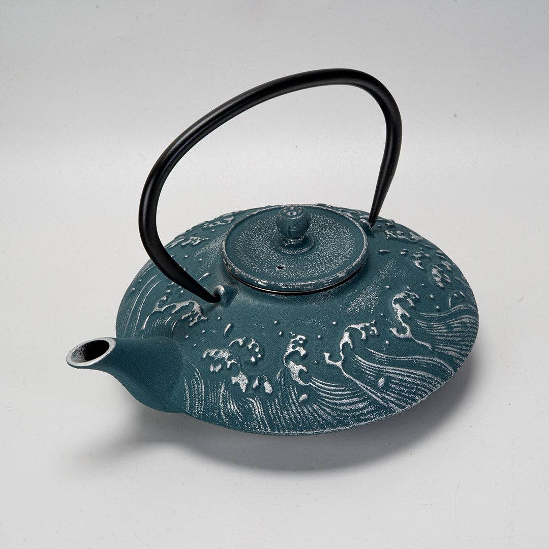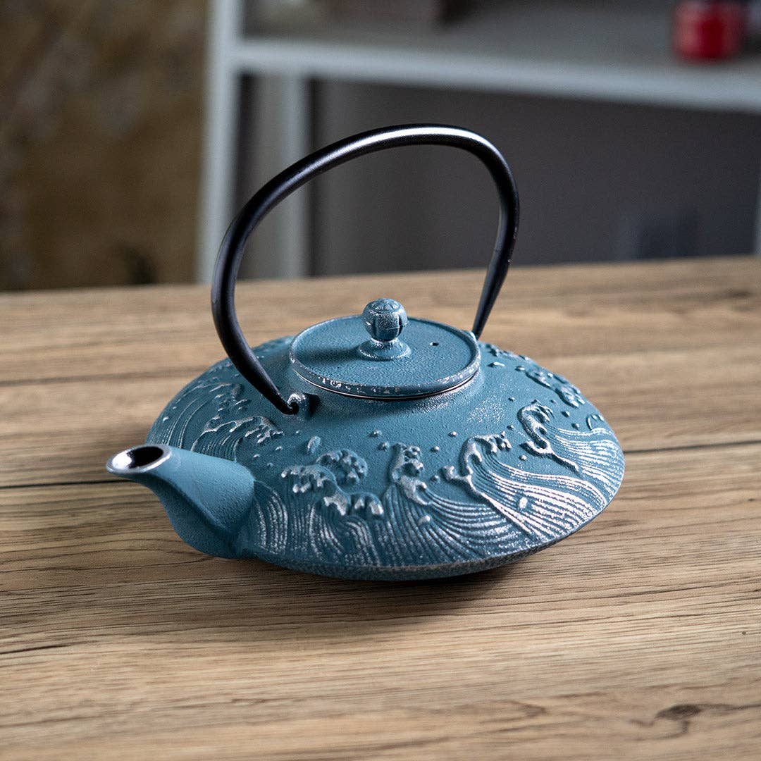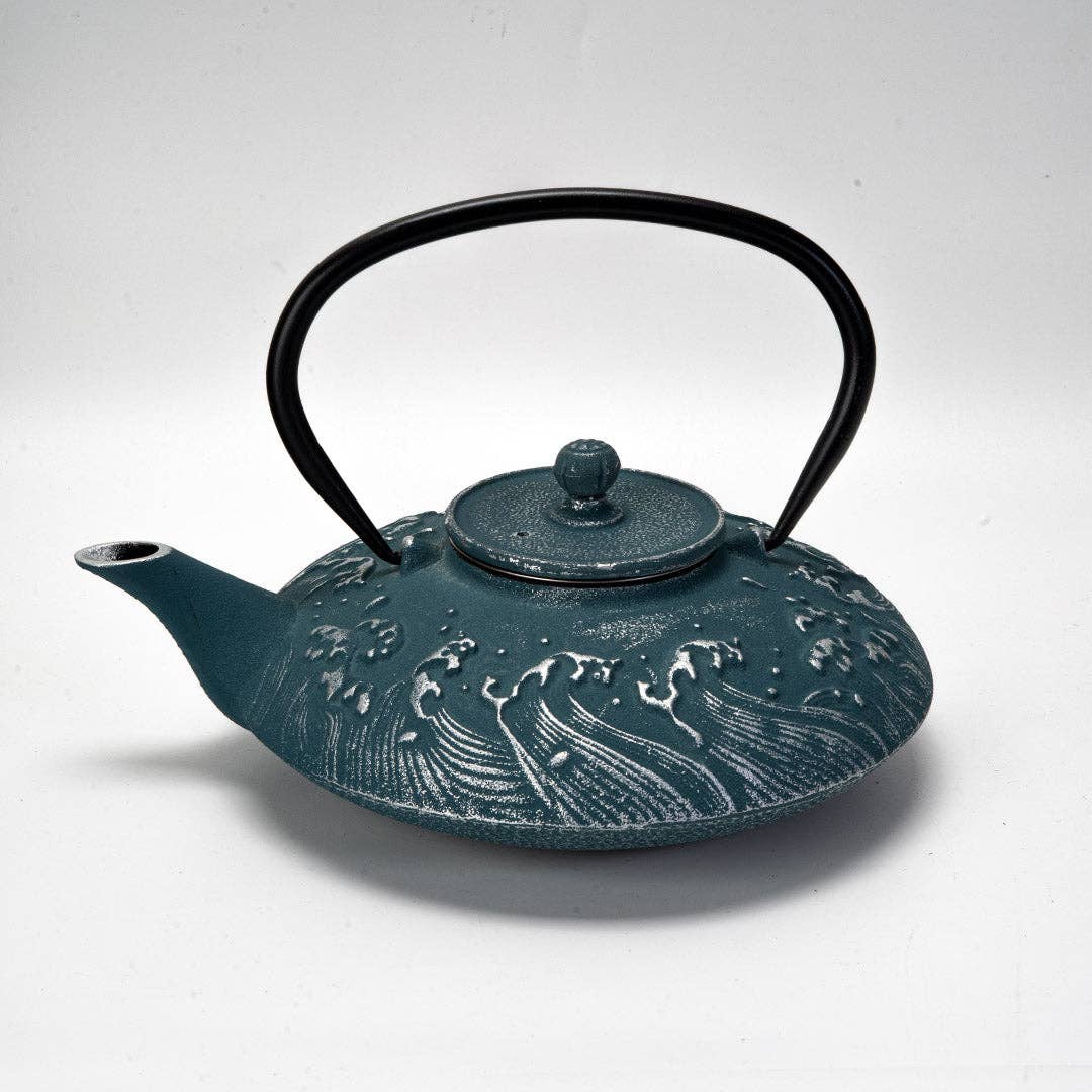 Royal Blue Waves Cast Iron Tea Pot with Two cups